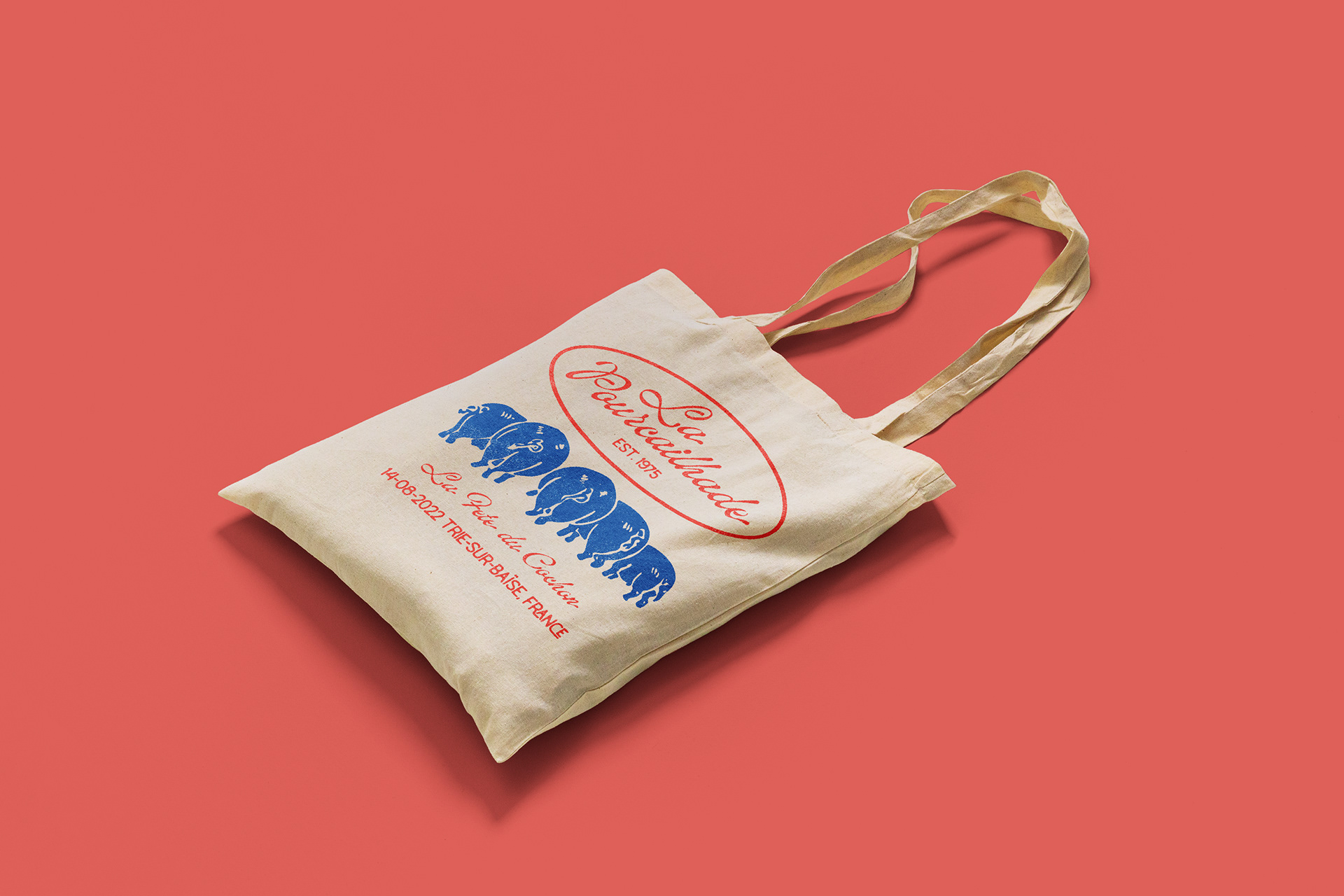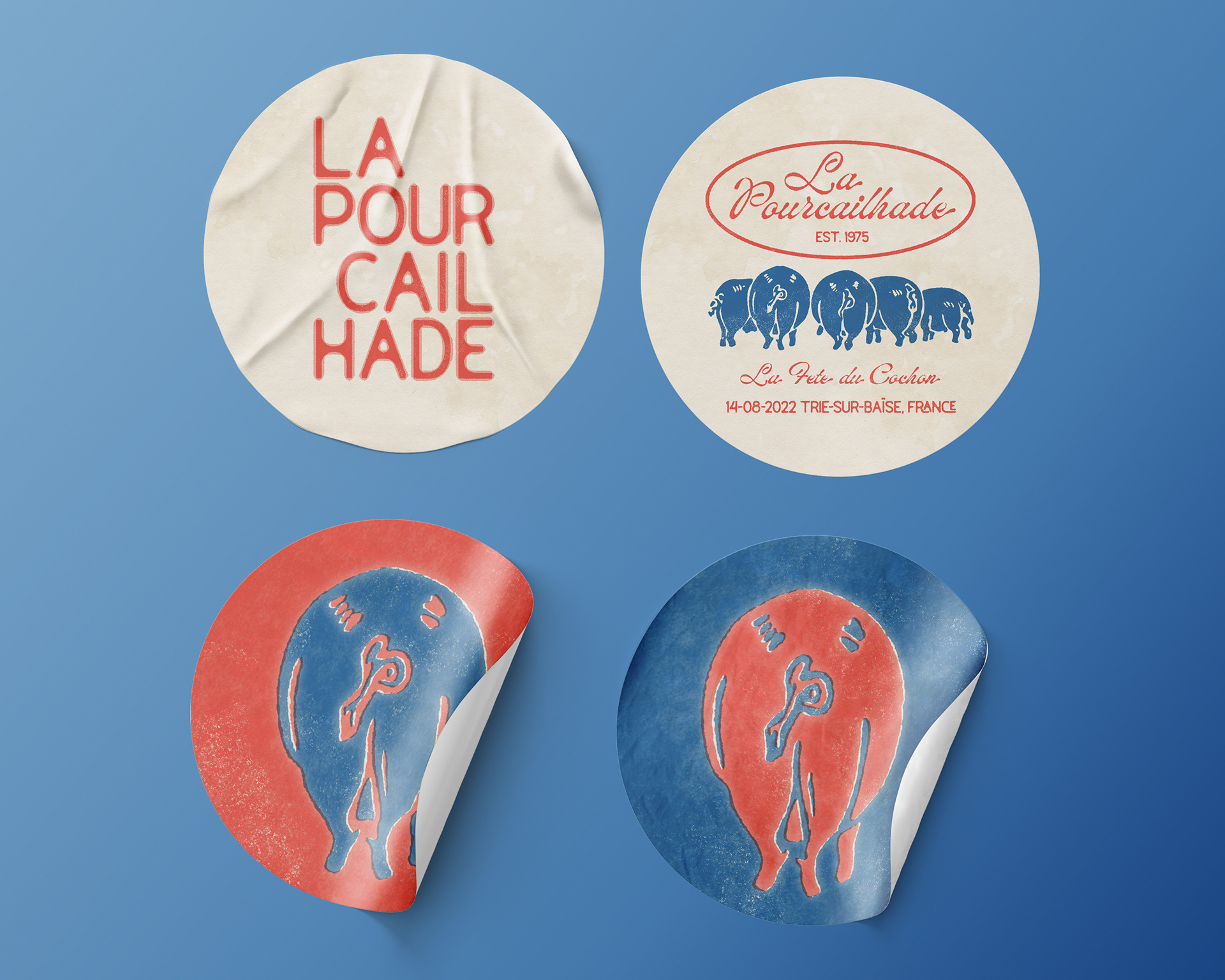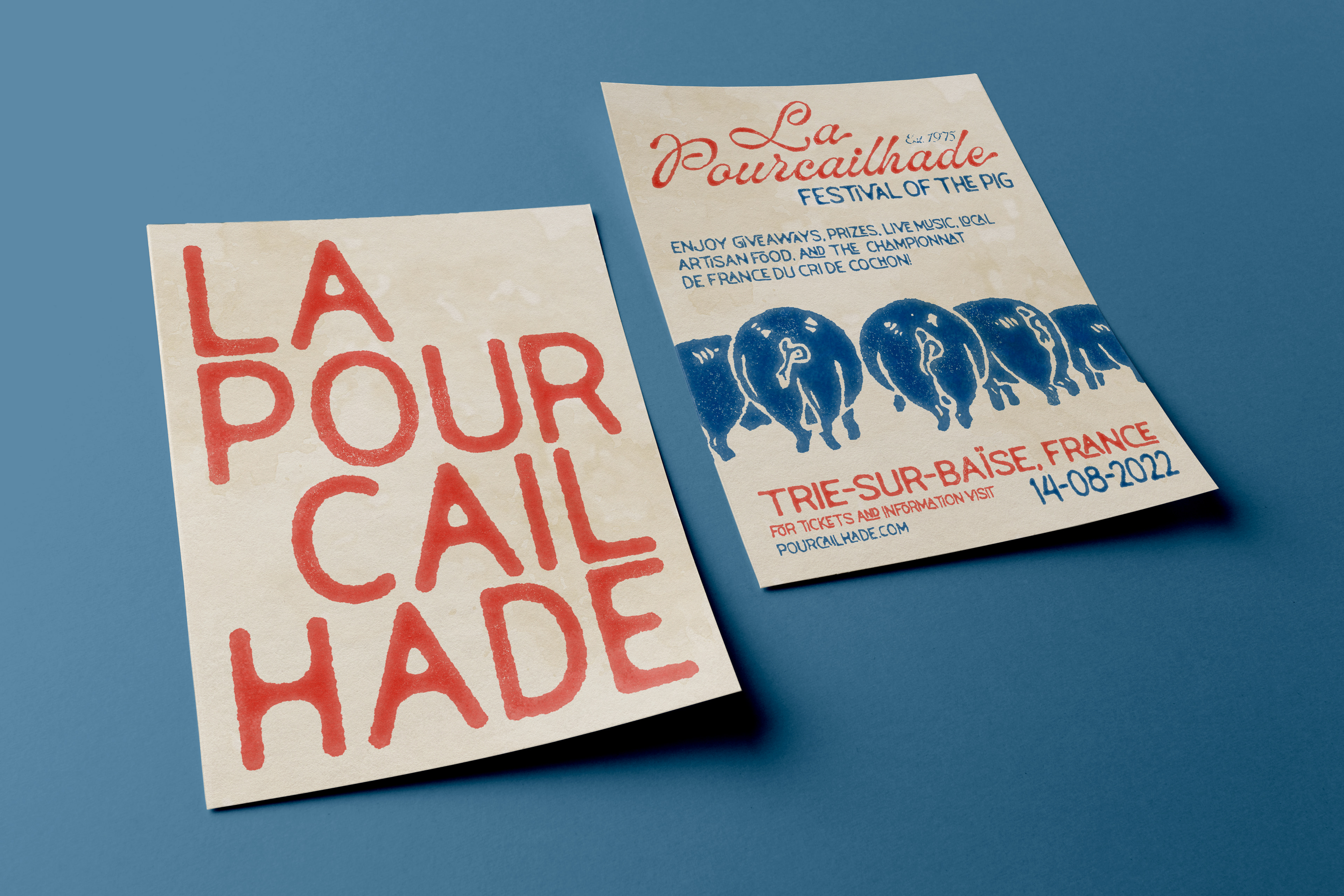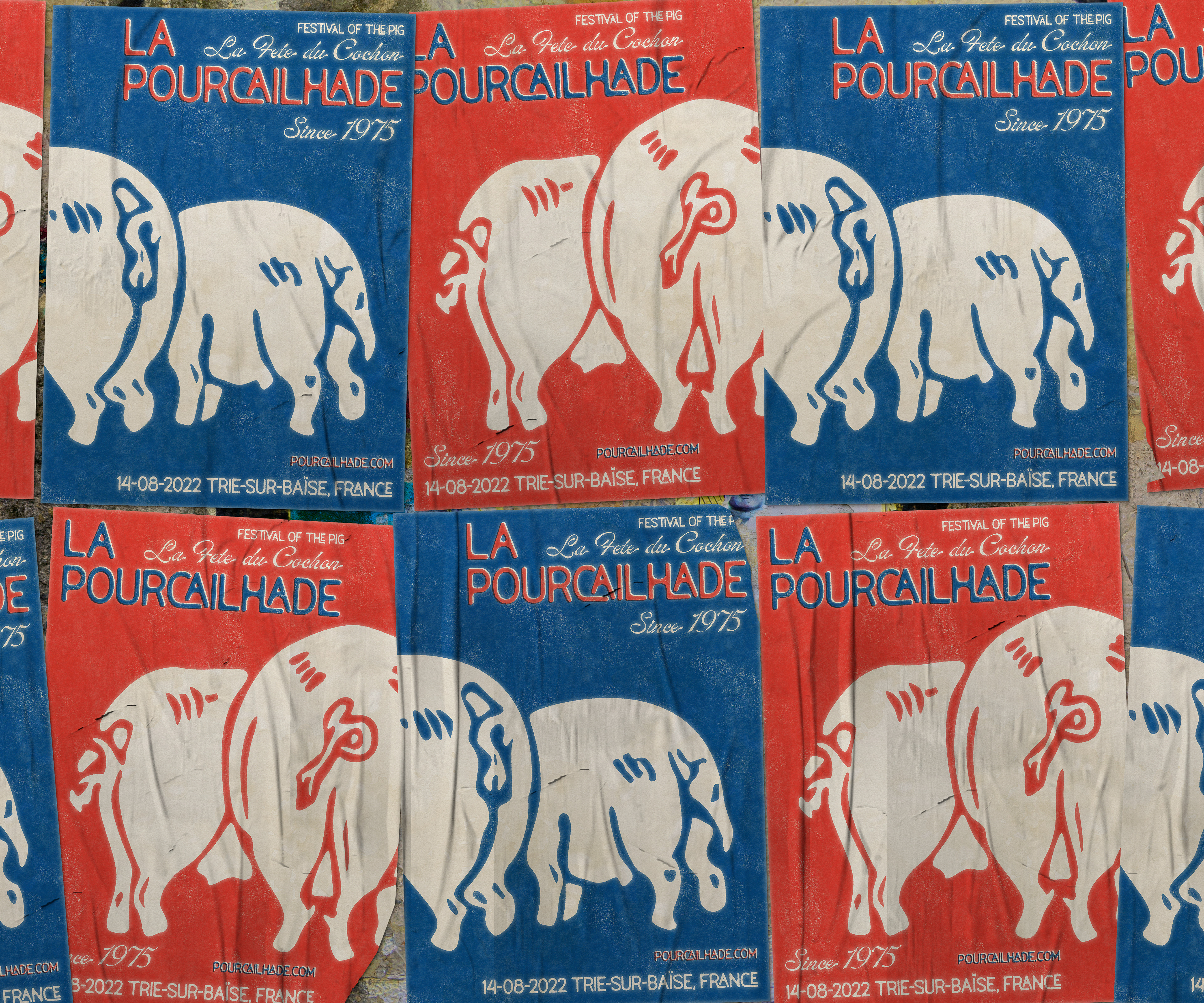Identity design for an annual French festival celebrating the pig, inspired by relief printing, letterpress, and vintage travel posters. This design reflects the rustic charm of the event and location.