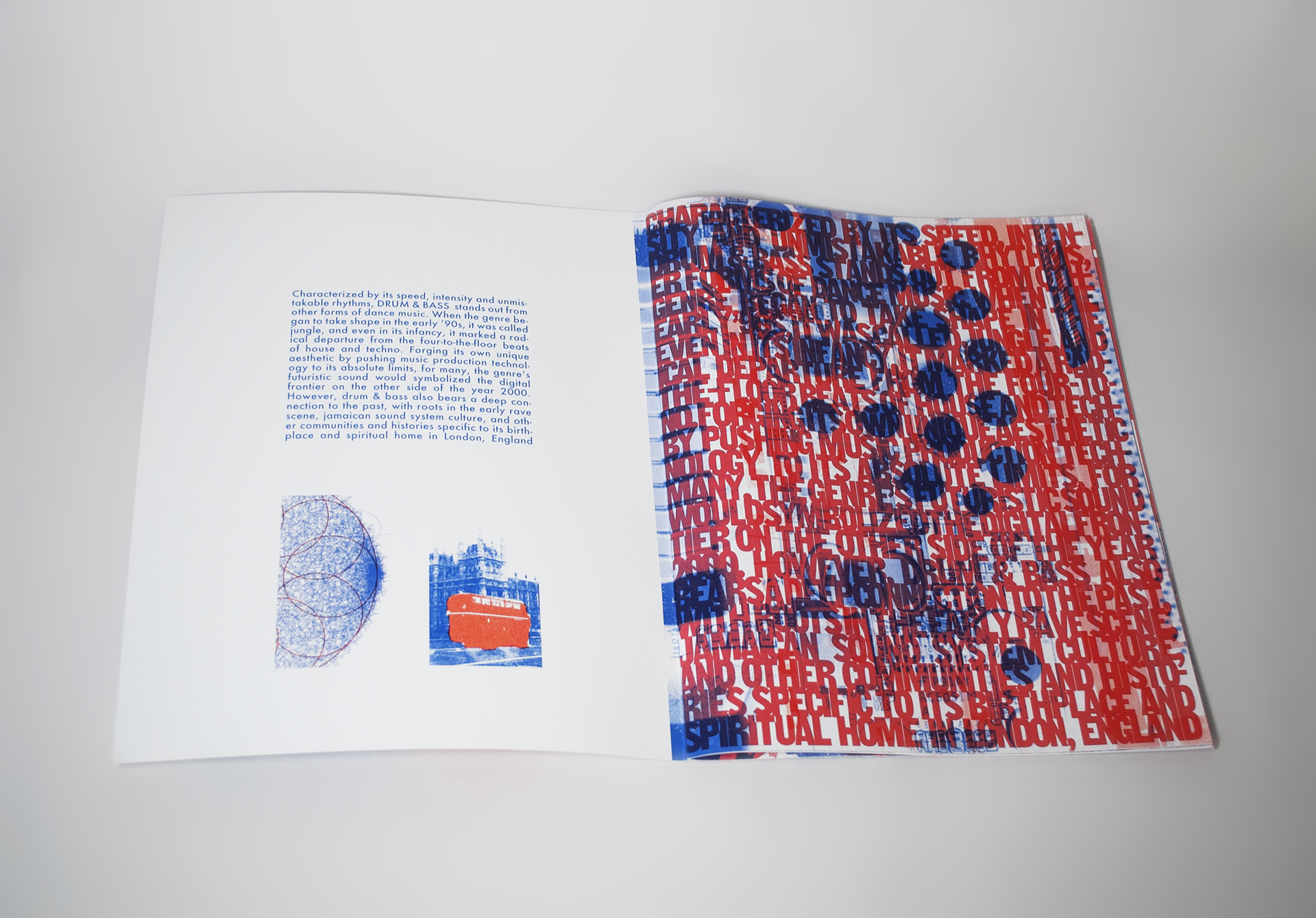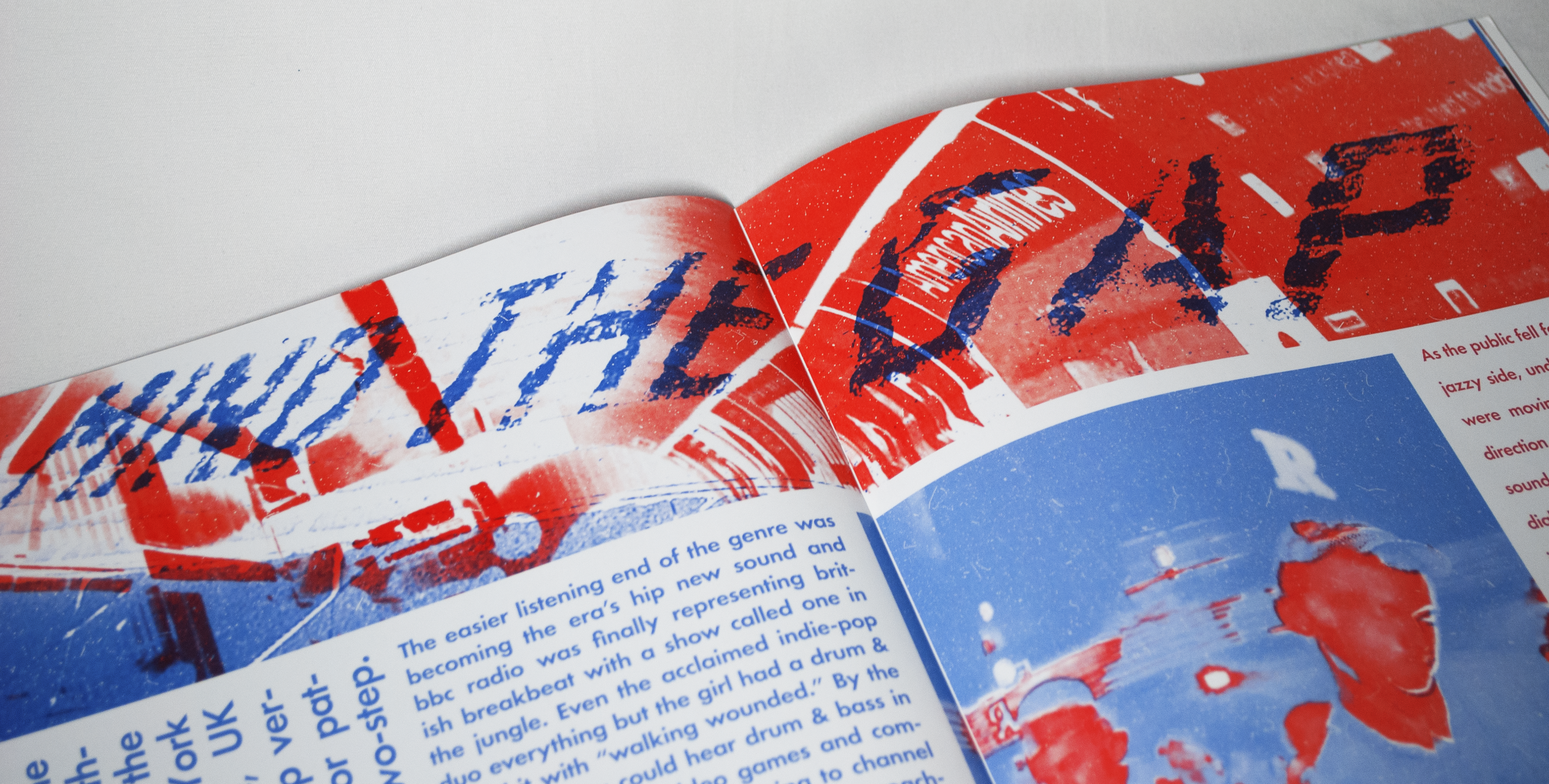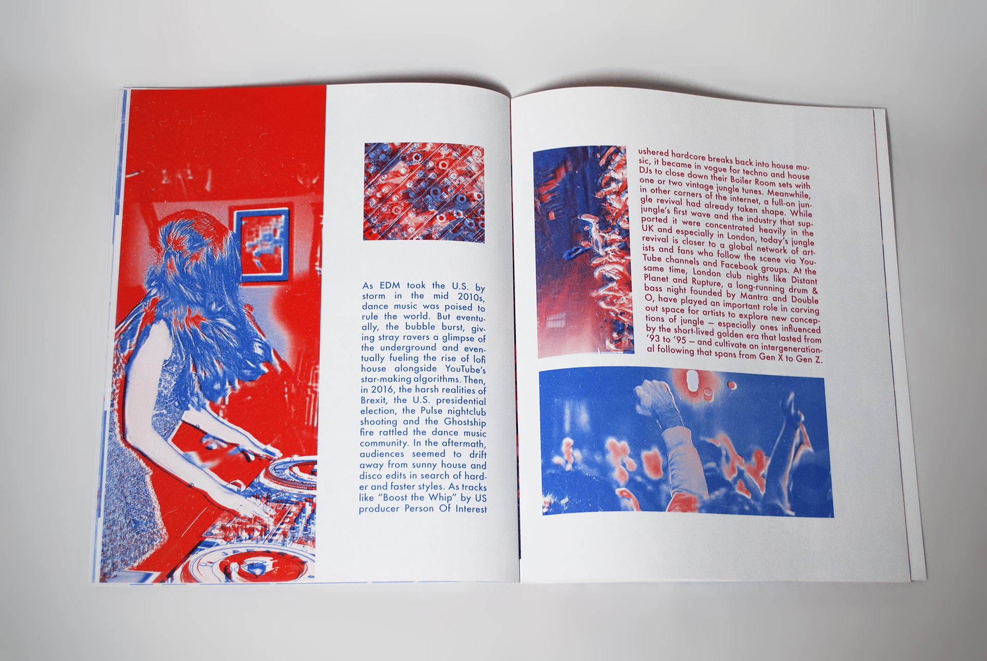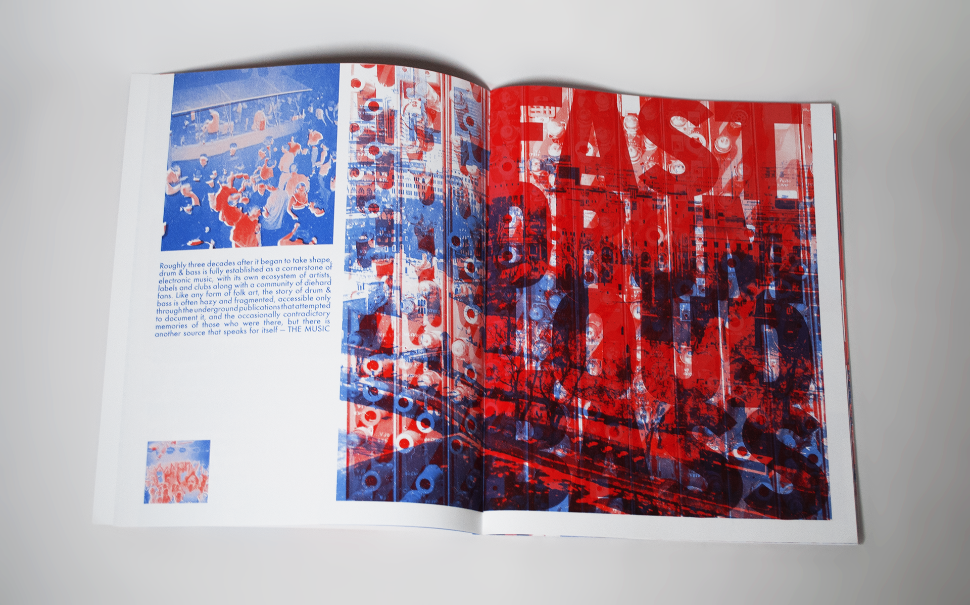 Risograph-style Zine celebrating the origins of Drum & Bass music in the UK. The layouts and design follow a dynamic and DIY aesthetic.