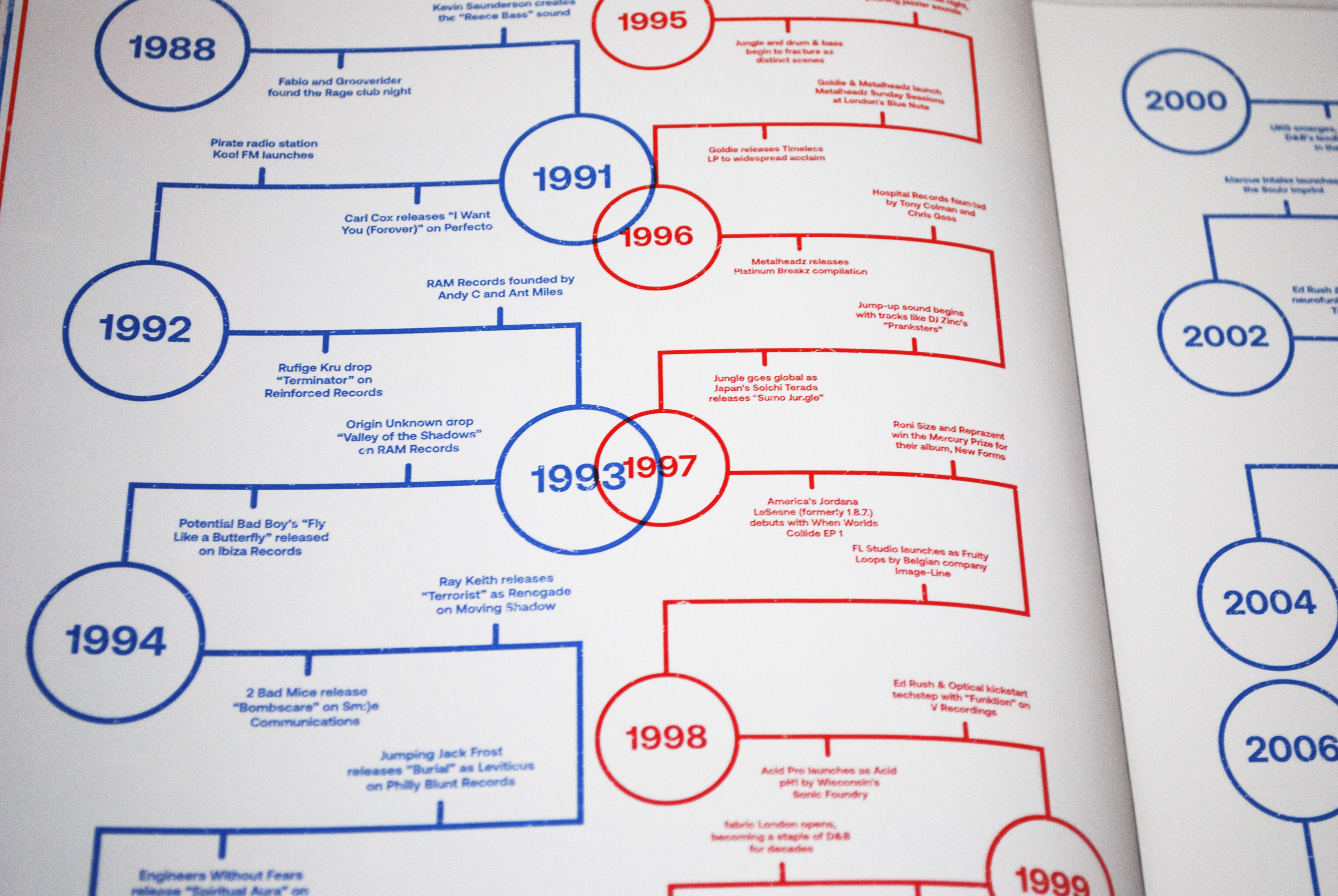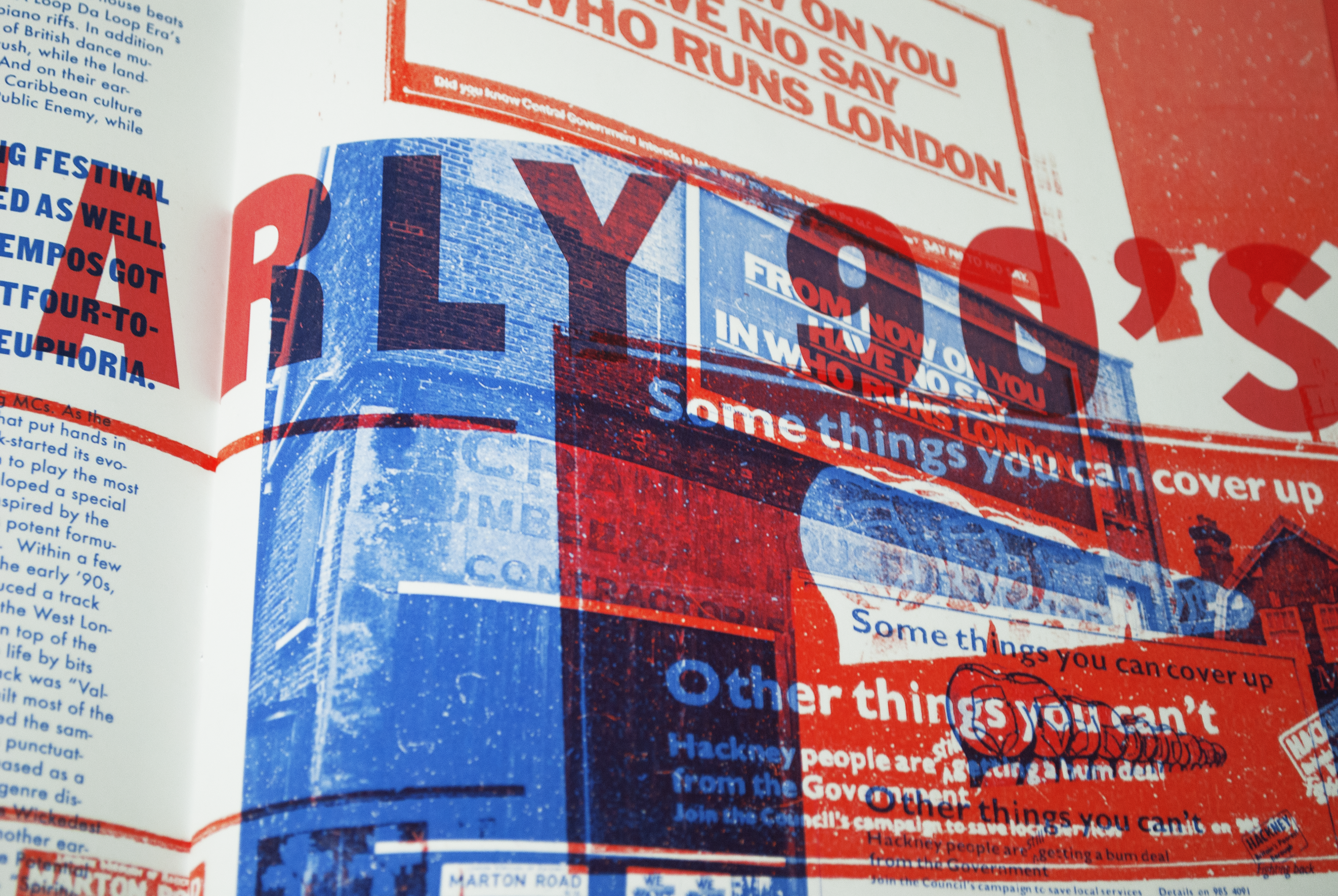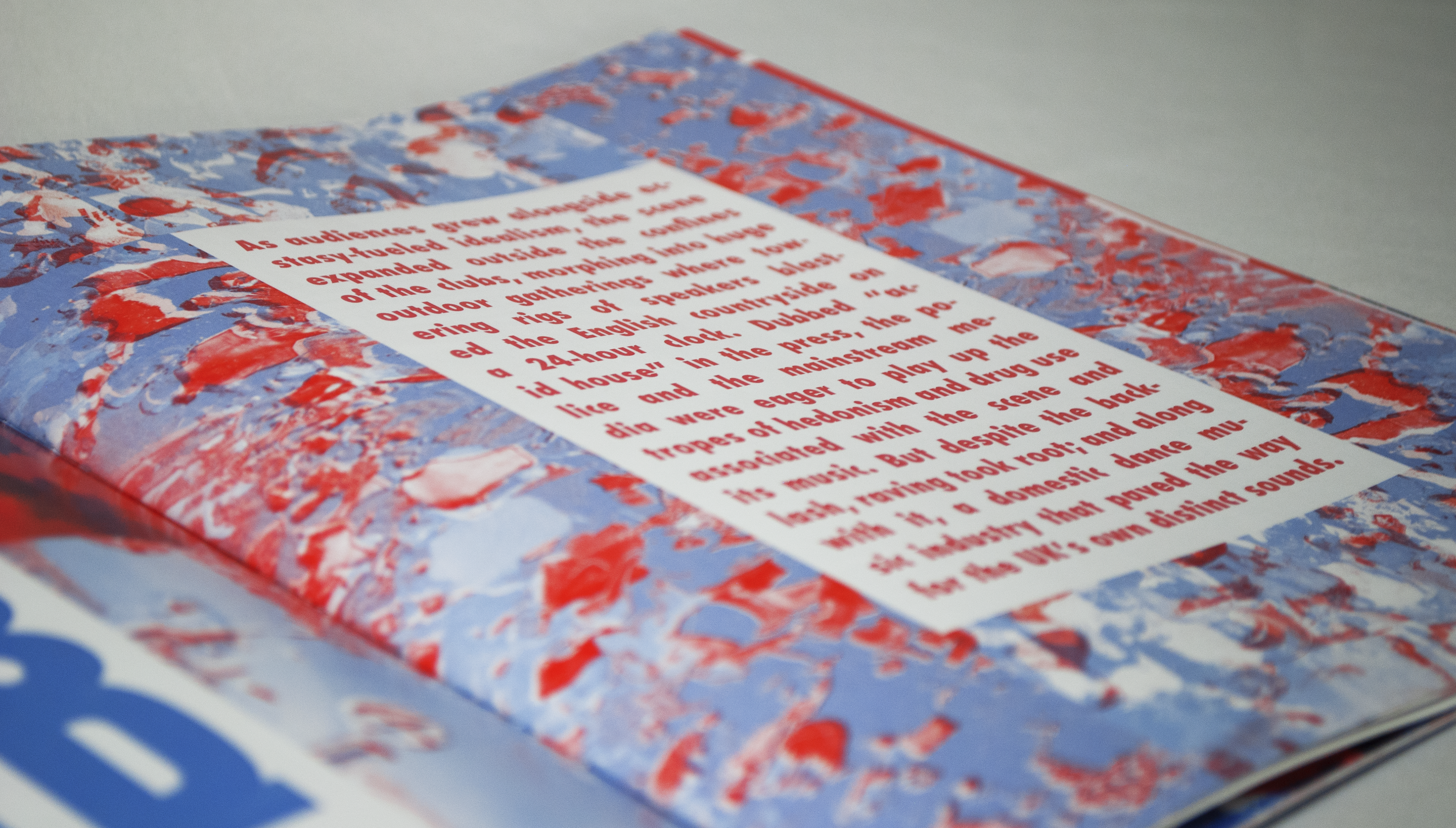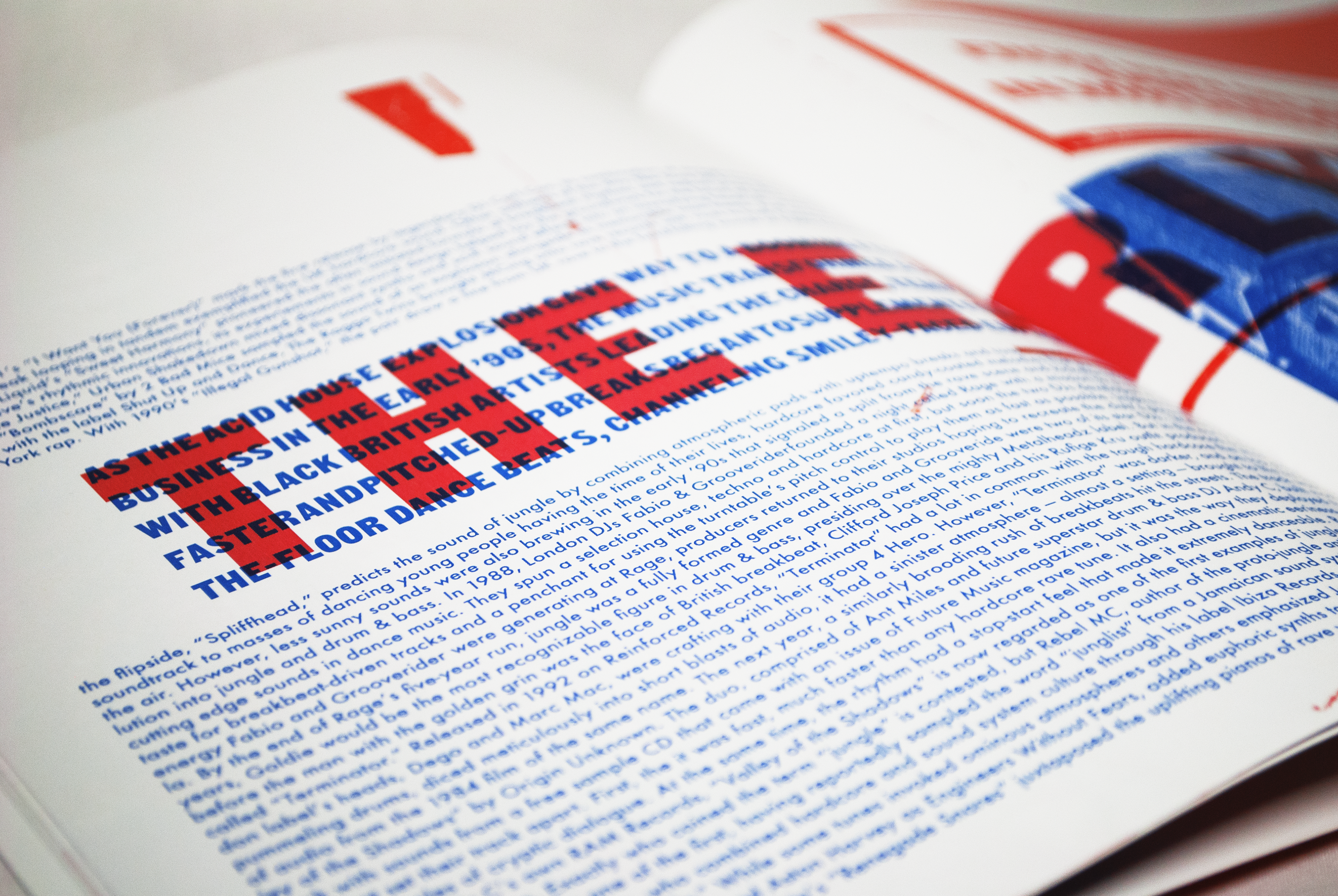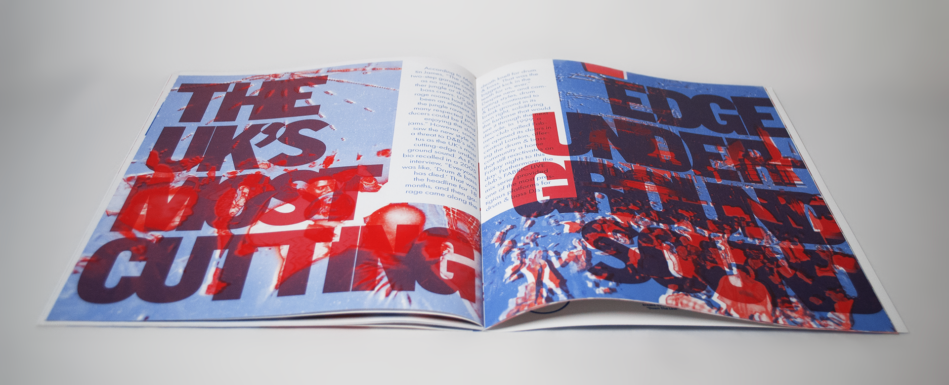 Risograph-style Zine celebrating the origins of Drum & Bass music in the UK. The layouts and design follow a dynamic and DIY aesthetic.
